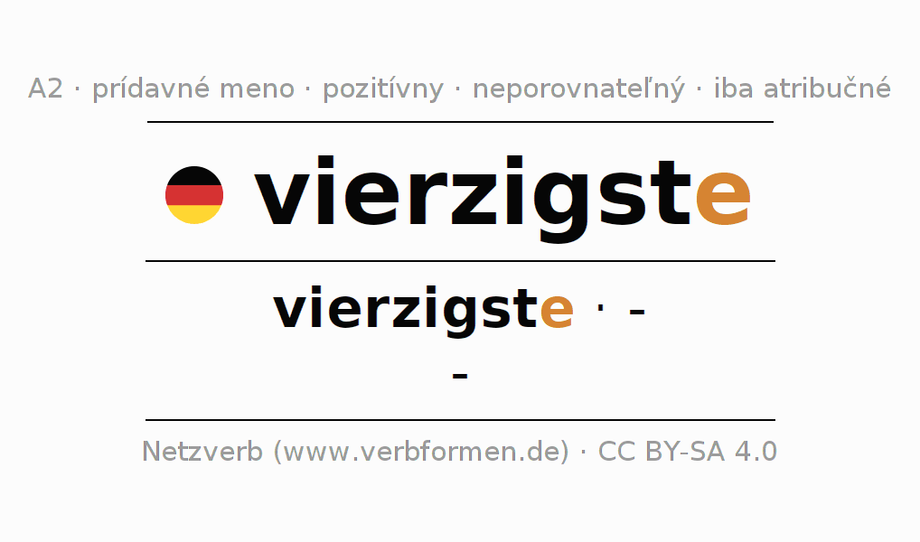 Skloňovanie prídavného mena vierzigste (štyridsiaty) prebieha pomocou nestupňovateľného tvaru vierzigste. Prídavné meno nemá tvary pre komparatív ani superlatív. Prídavné meno vierzigste sa môže používať iba ako prívlastok pred podstatným menom, s členom aj bez neho, v silnom, slabom a zmiešanom skloňovaní, ale nie ako menný prísudok s časovým slovesom.Tu môžete nielen skloňovať a stupňovať vierzigste, ale aj všetky nemecké prídavné mená. Komentáre ☆