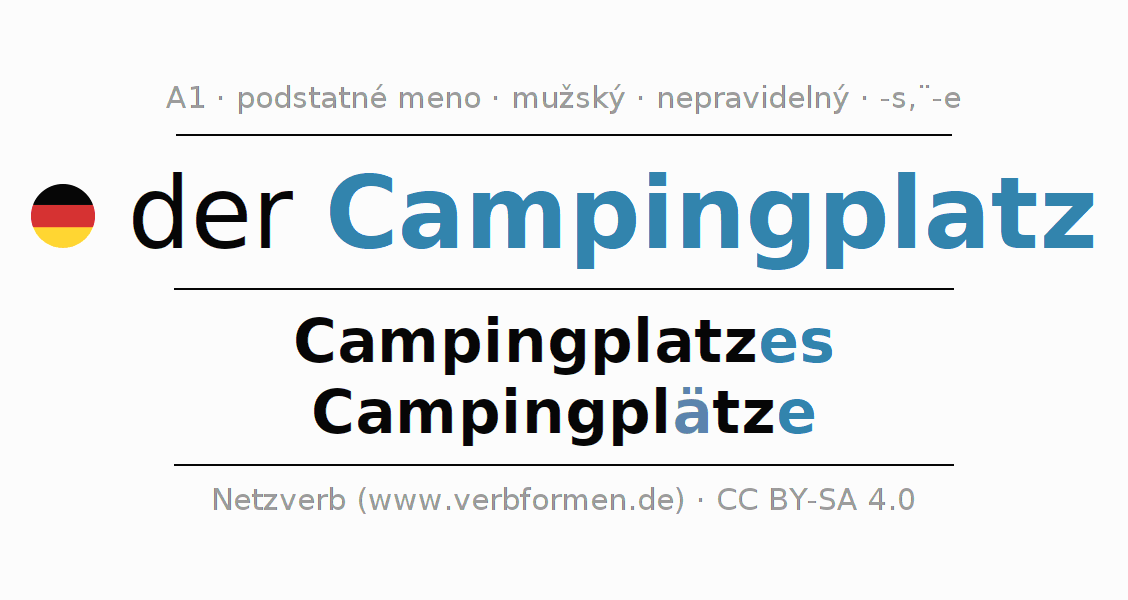 - Množné číslo: die Campingplätze, der Campingplätze, den Campingplätzen, die Campingplätze