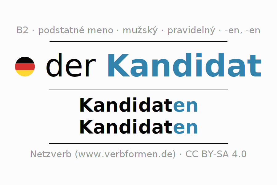 - Množné číslo: die Kandidaten, der Kandidaten, den Kandidaten, die Kandidaten